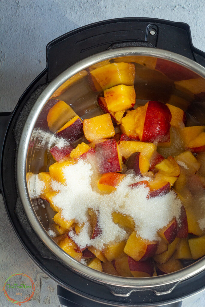 - Transfer the diced peaches in the inner pot or the Instant Pot. Add sugar and lemon juice and mix properly. Let this sit for at least 30 minutes so that juices are released.