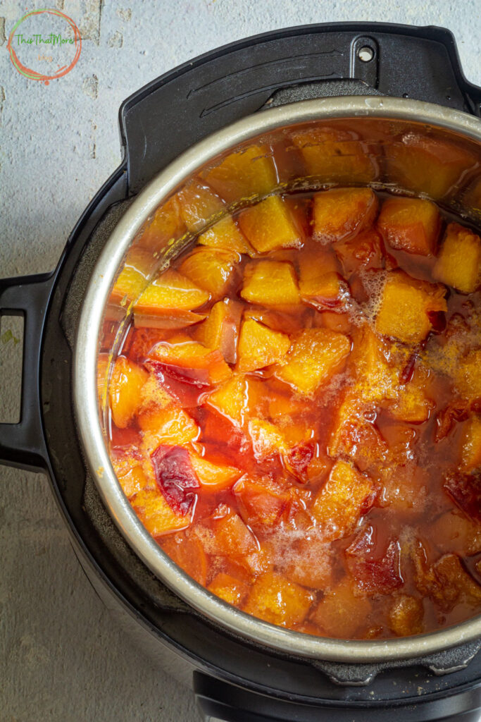 - Add peaches in the instant pot and mix sugar and lime juice with them. Let it sit for 30 minutes until the juices are released.