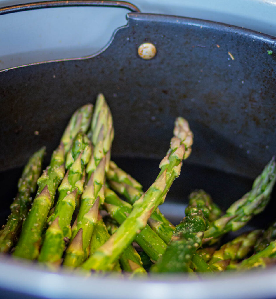 - AIR FRYER: Place asparagus in an air fryer. Air-fry asparagus for 8-10 minutes at 400°F until it is a little crisp & bright green in color. (Note: Don't overcrowd the air fryer basket. Keep stirring the asparagus in between for even cooking).OVEN COOKING: Preheat oven at 425°F for 15-20 minutes. Line asparagus in a baking sheet and tray. Once the oven is preheated then place the baking tray in the oven. Bake for 15 minutes until the asparagus is evenly roasted.
