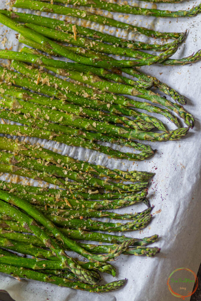 - Transfer the roasted asparagus in a bowl or serving plate. Garnish the asparagus with some parmesan cheese, nutritional yeast, and some lemon juice.