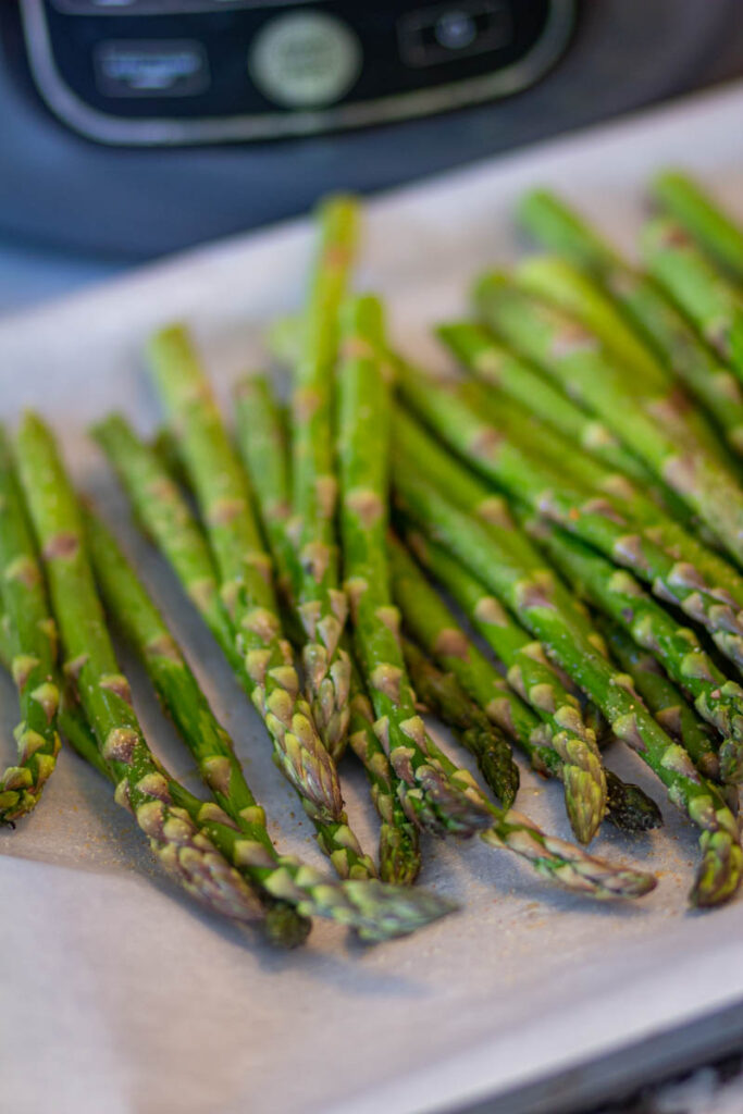 - AIR FRYER: Place asparagus in an air fryer. Air-fry asparagus for 8-10 minutes at 400°F until it is a little crisp & bright green in color. (Note: Don't overcrowd the air fryer basket. Keep stirring the asparagus in between for even cooking).OVEN COOKING: Preheat oven at 425°F for 15-20 minutes. Line asparagus in a baking sheet and tray. Once the oven is preheated then place the baking tray in the oven. Bake for 15 minutes until the asparagus is evenly roasted.