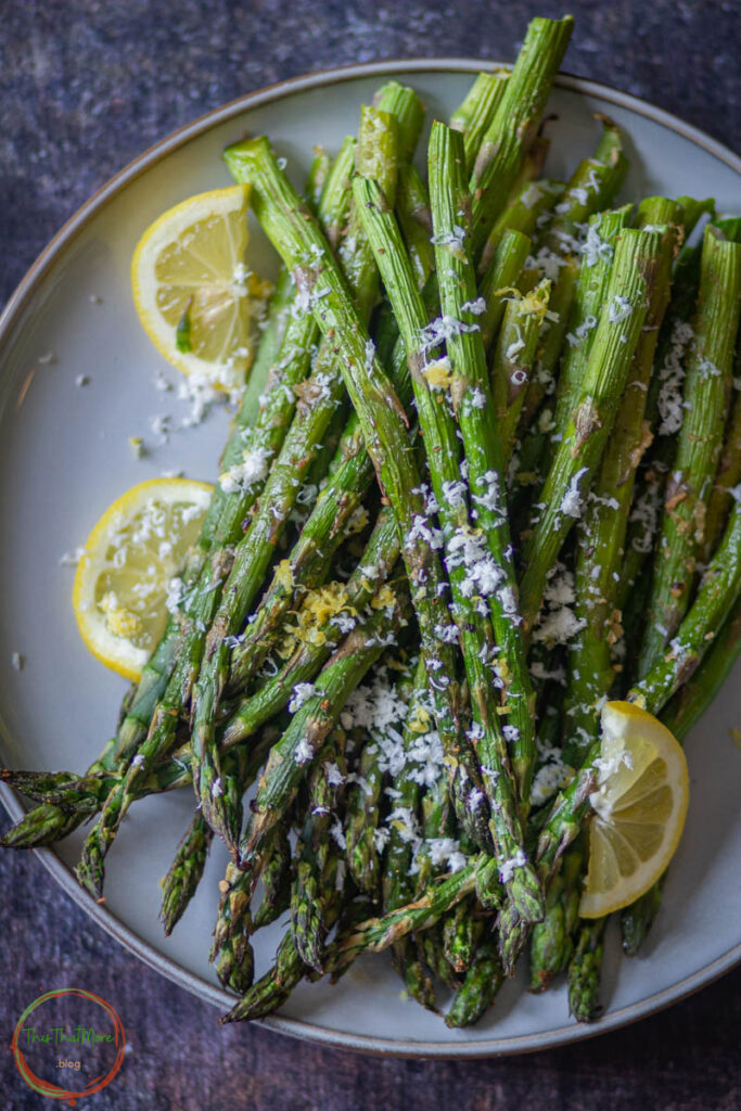 - Transfer the roasted asparagus in a bowl or serving plate. Garnish the asparagus with some parmesan cheese, nutritional yeast, and some lemon juice.