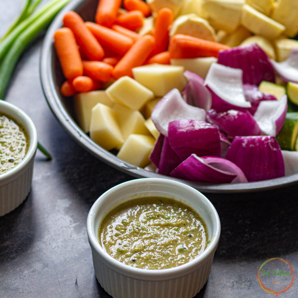 One of my good friends is from Jamaica and a serious cook. She used to make a really spicy jerk chicken. She always makes mango chutney along with it. The sweetness of the chutney is the perfect addition to Caribbean Jerk Vegetables. This kind of completes the whole Jerk experience for me. According to her, the secret of a perfect Jerk seasoning is the right combination of spice & sugar. And Thyme never hurts. Ideally, you get the "heat" using scotch bonnet peppers but here I am using jalapeno instead.