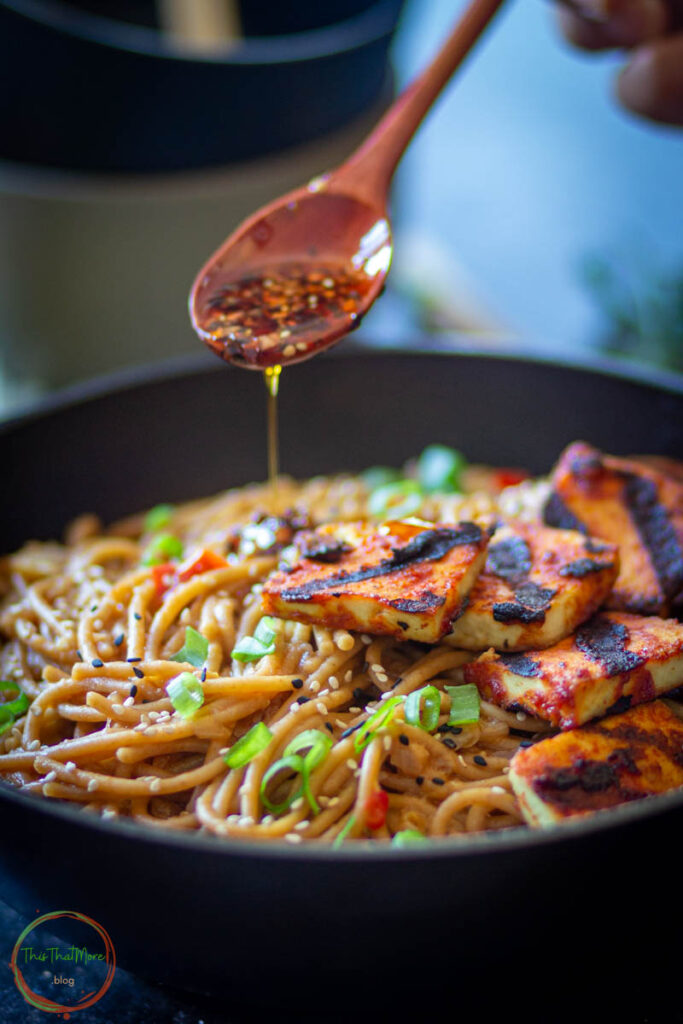 I usually like to prepare Chili Garlic Noodles with some Chili Oil. Chili Oil is Chinese spiced oil that is prepared with Sichuan Chili Flakes & Peppercorns. This gives a unique flavor to the recipe & often tastes like street-style noodles. You can get a store-bought or can also use the Homemade Chili Oil.