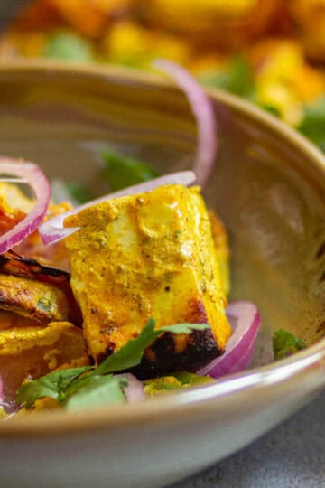 • Hariyali paneer tikka made in air fryer with onions and bell peppers.