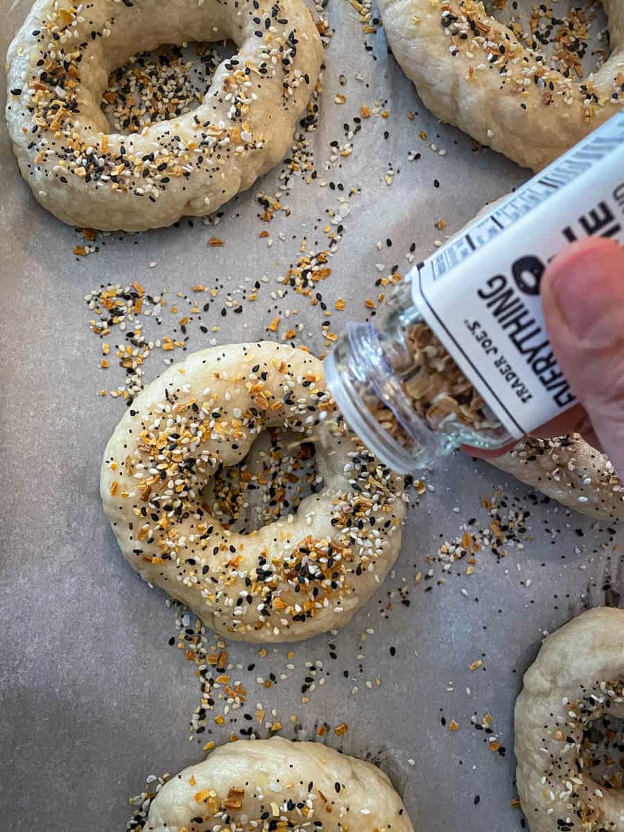 - You can add seasonings like everything bagels or fried onion or sesame seeds. Add the seasoning just after bagels come out of the water bath and are still wet. Seasoning will not stick if the water is dried out from the bagels.
