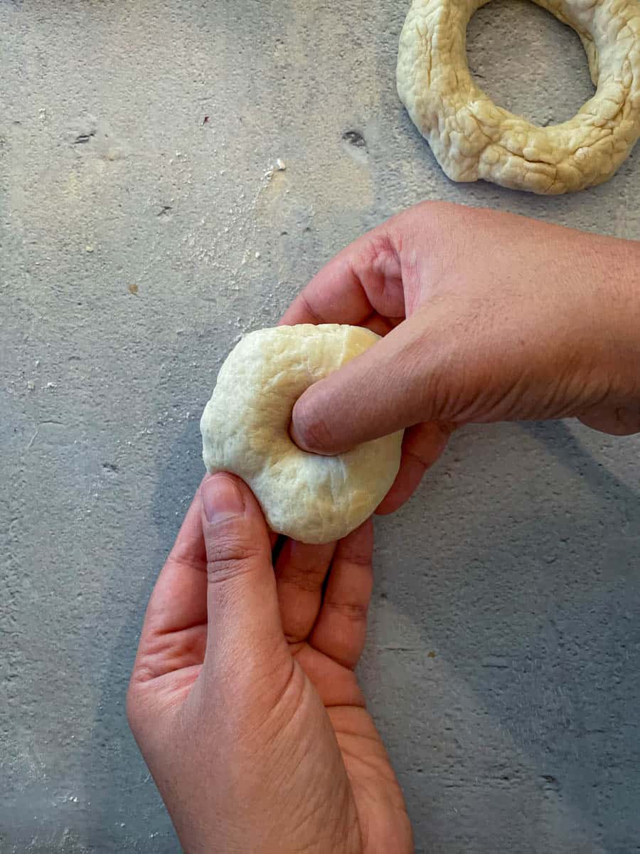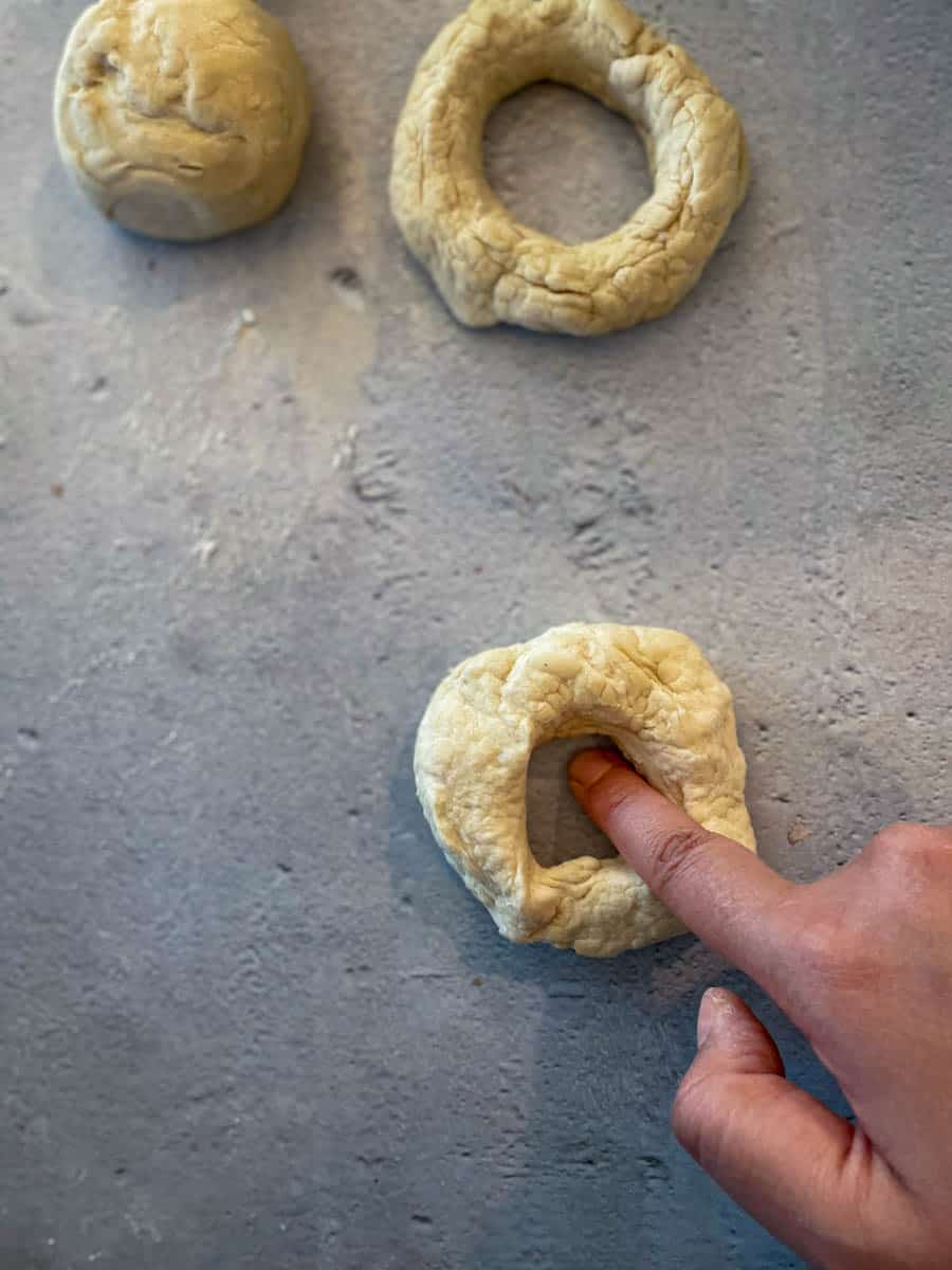 - Once the water bath comes to a boil and the dough has risen then it is time to shape the bagels. Take one ball and poke a hole in the center using your index finger. Stretch the dough and twirl it around until the bagel is 1 ½"-2" in diameter. Or you can also use a bagel baking pan.