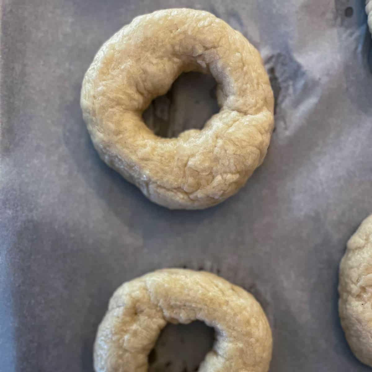 - Line the baking sheet with parchment paper. One by one transfer the prepared bagels to the water bath. Do not crowd them. Just add 2-3 bagels at one time. Cook the bagels for 2 minutes on one side. Then flip the bagel and cook it for 1 more minute on the other side. Strain the bagels out from the water bath and place them on the baking sheet.