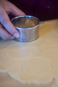 - MAKE COOKIES: Make cookies by rolling the dough between two sheets of parchment paper until it is ¼" thick. Cut the cookies using a cookie cutter in even sizes. Shape one side of cookies in the middle with a small cookie cutter.