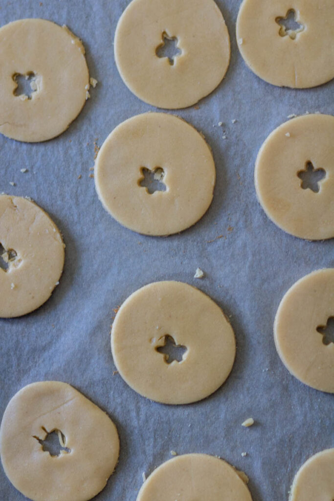- LINE THE COOKIES: Pick the plain cookies one by one and add jam to them. Then put these cookies with the cut-out cookies so as to make a cookie sandwich with the jam in between.