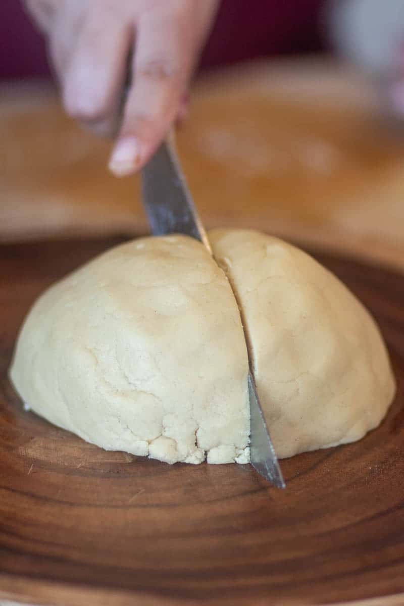 - MAKE THE DOUGH: Make the dough by mixing flour (all-purpose & almond) with butter, sugar, almond extract, salt, and cinnamon. You can knead with hand or make it using a food processor.