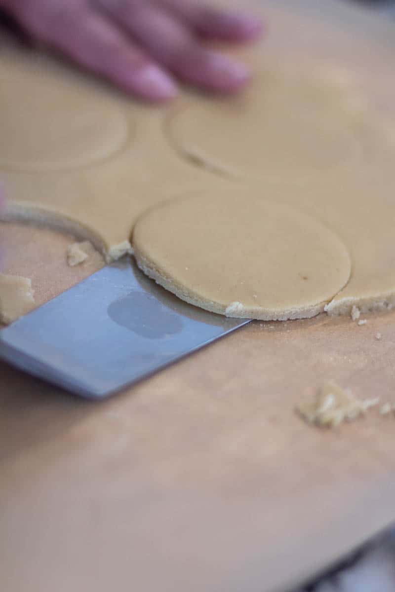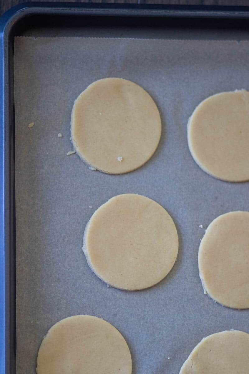 - MAKE COOKIES: Make cookies by rolling the dough between two sheets of parchment paper until it is ¼" thick. Cut the cookies using a cookie cutter in even sizes. Shape one side of cookies in the middle with a small cookie cutter.