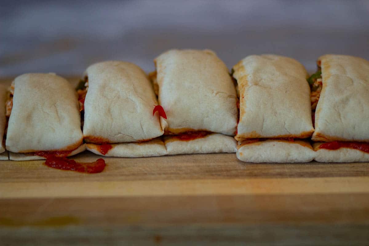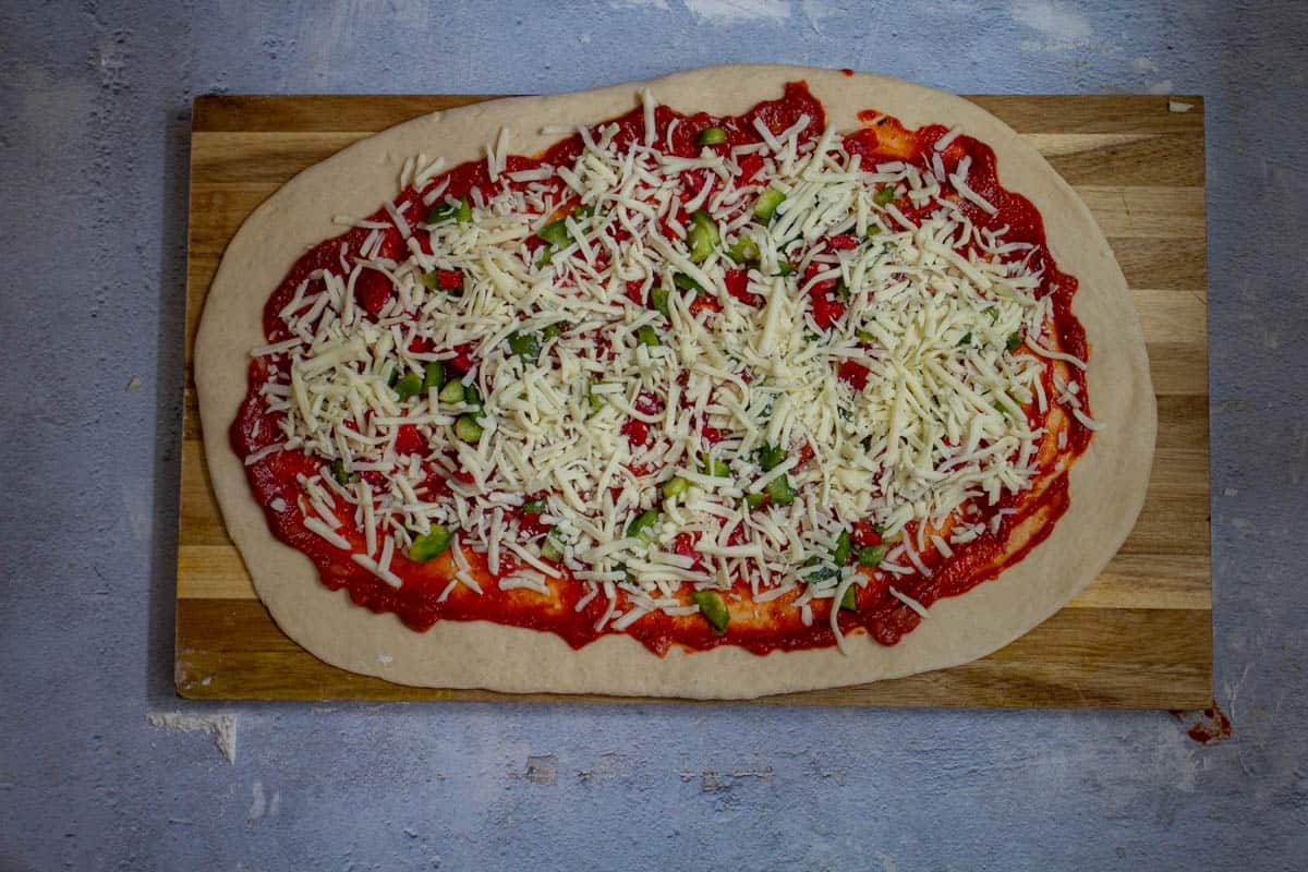 - ADD TOPPINGS: Add a generous layer of pasta sauce (homemade or store-bought) in the middle. Add bell peppers and a generous layer of cheese. Leave the sides, as it will help in rolling the dough if it doesn't have any sauce there.