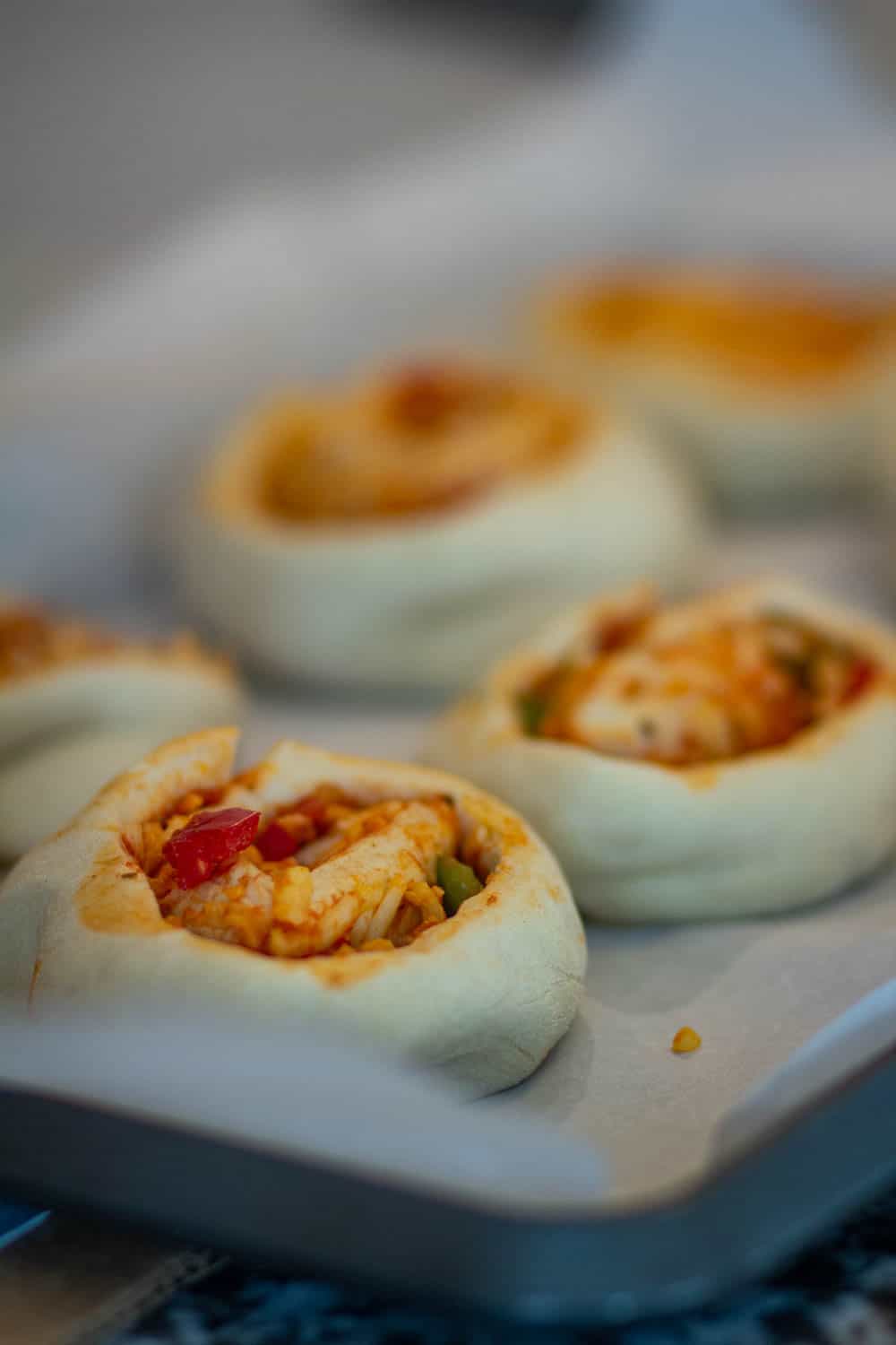 A Pizza Bun is basically a pizza shaped like a pinwheel bun. It is made by using a yeast dough that is flattened out and then the stuffing of pizza sauce, cheese, and bell peppers, etc is added. Then it is rolled into a log and equal-sized buns are cut from the log.