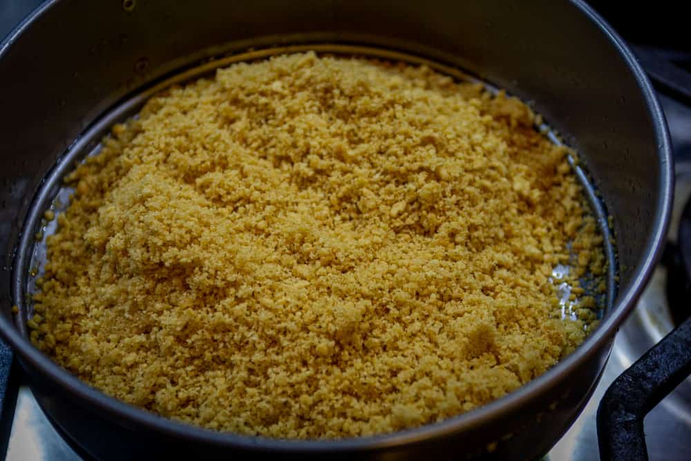 - Add this graham crumbs mixture in a 7-inch springform pan. Using fingertips or a cup, press them so they form an even layer. Place the pan in the freezer while you prepare the rest of the batter. Or you can also leave in the refrigerator for 1-2 hours.