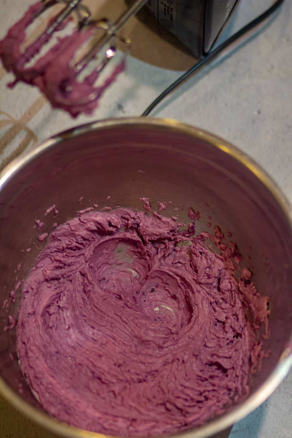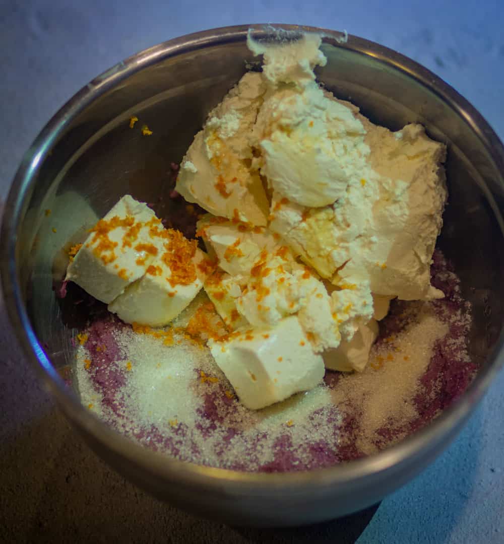 - Add sugar and purple sweet potato and mix them together. Then add cream cheese, heavy cream, orange extract, vanilla extract or Ube extract, Ube jam, and blend until smooth.