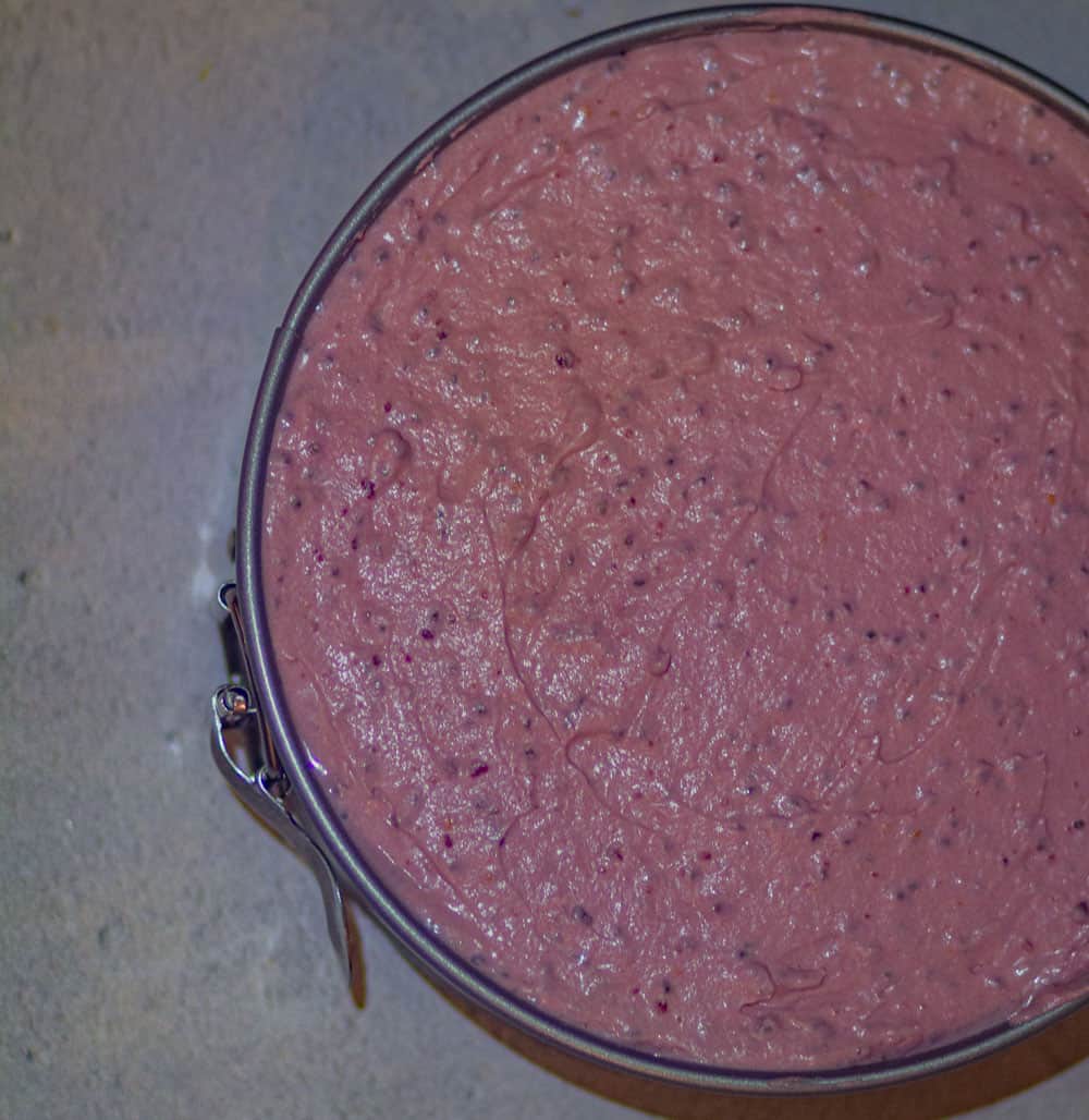 - Remove the springform pan from the freezer and pour the batter in it. Cover the pan with the aluminium foil.