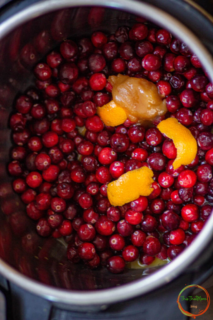 - Transfer the rinsed cranberries to the inner pot of the Instant Pot. Add Agave Syrup/Maple Syrup/Honey, salt, orange juice, orange zest, and salt and mix properly.