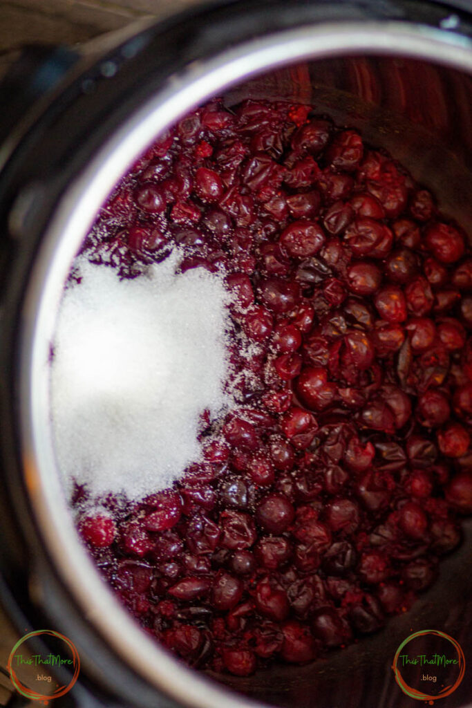 - Once the pressure is released, open the lid. Press Saute. Stir the cranberries and break them using a wooden spoon. Add sugar and stir until combined. The heat will melt the sugar and make the cranberry sauce thick.