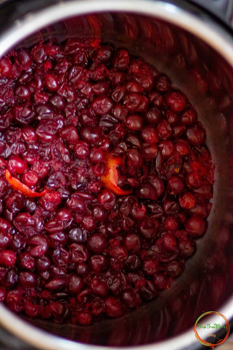 - Once the pressure is released, open the lid. Press Saute. Stir the cranberries and break them using a wooden spoon. Add sugar and stir until combined. The heat will melt the sugar and make the cranberry sauce thick.