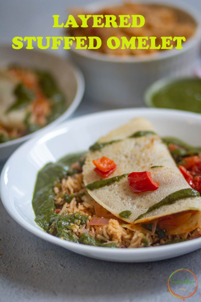 - For layering first, add Spanish Rice on a plate. Then layer with stuffed Omelet over the rice, and finally spread a thick layer of Cilantro- Jalapeno Sauce all around the edges of the rice.