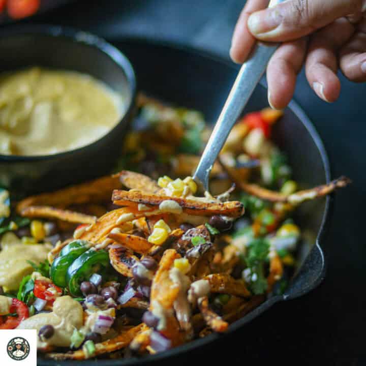 Loaded Sweet Potato Fries is healthy, easy, and is made from scratch. It is the perfect food for the game night and an ideal crowd-pleaser. It is made by frying/ baking the sweet potato fries and loading them with the topping of corn, jalapeno, avocado, and cheese sauce.