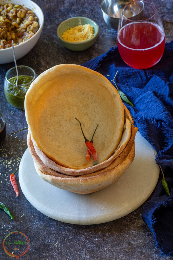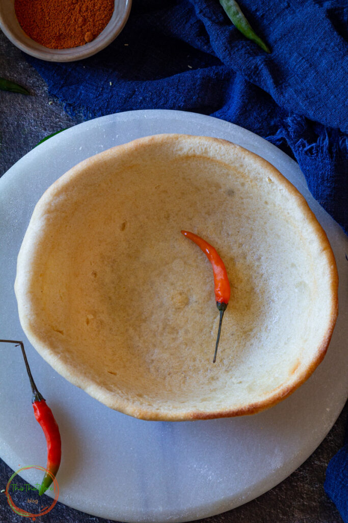 Homemade Naan Bowl is perfect for thick Chole/Chickpeas or can be used in Chaat. They are crisp from the outside but still have a soft interior. I have made it by first puffing the dough in an Instant Pot and later baking the Naan Bowl in the oven.