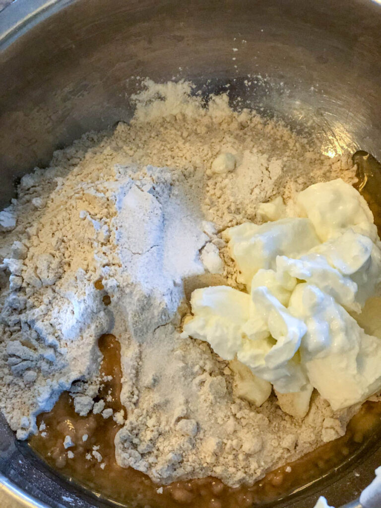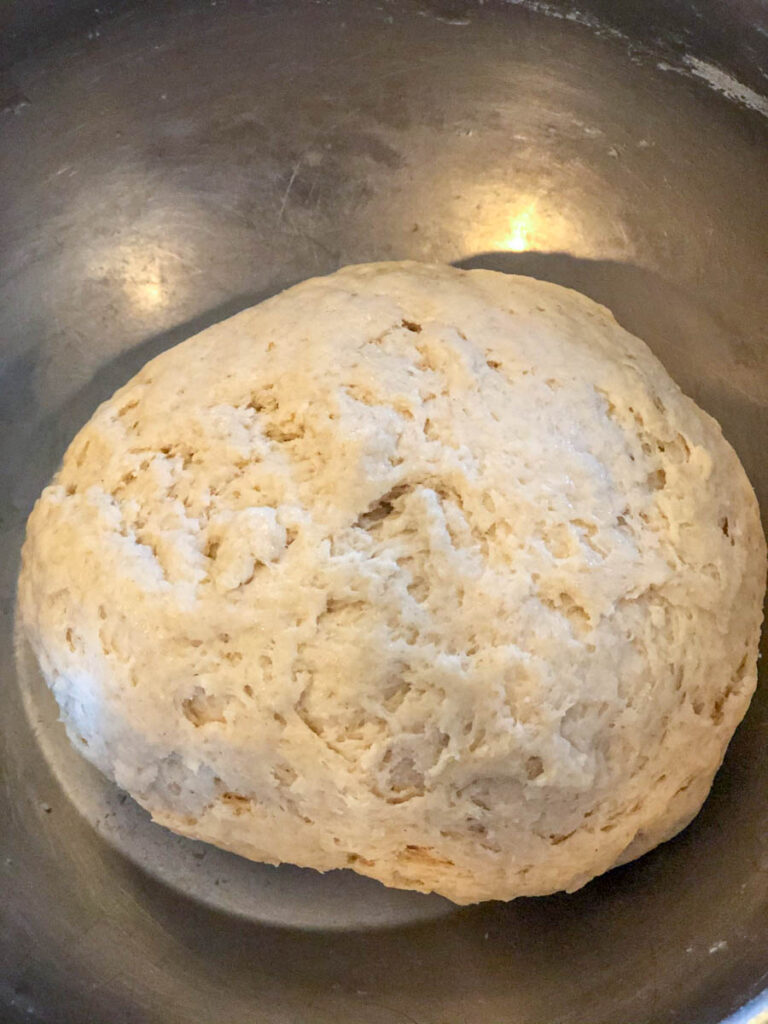 - In a stand mixer or in a mixing bowl, add all the dry ingredients and mix until combined. Then add all the wet ingredients. If needed, add water a little at a time. The dough should not be too soft or sticky but should be of medium consistency.