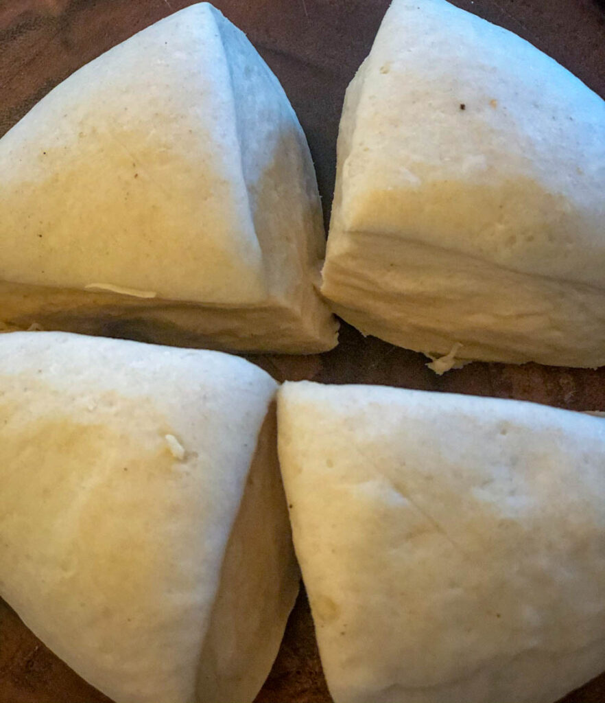 STEP 4 - MAKE BALLS: After the timer is done and the dough is puffed, knead it again. Divide the dough into 4 equal parts and roll them using a rolling pin like a roti/naan.