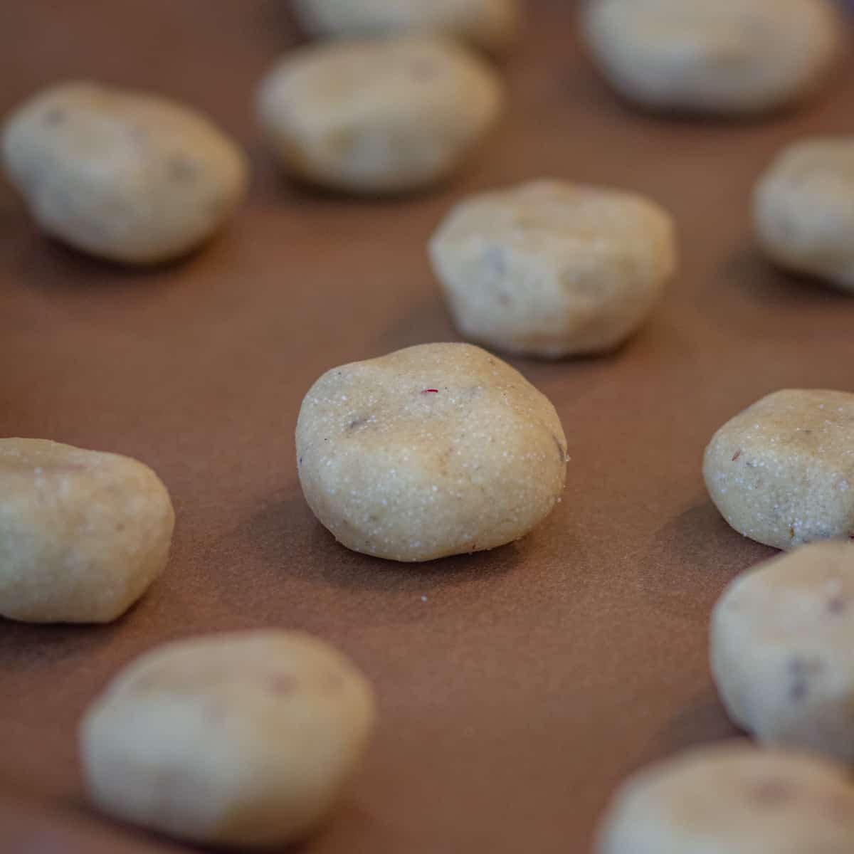 - In a baking tray, line the parchment paper. Then take the dough out and make equal size balls from the dough. The dough balls should be around 1-inch in diameter. Place these on the baking tray. (Note: Lightly flatten the dough and place the dough a little apart).