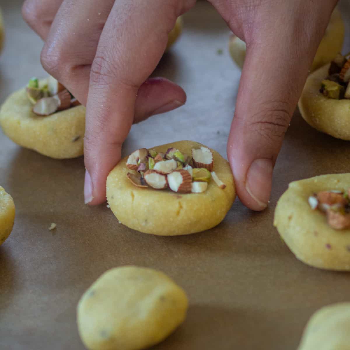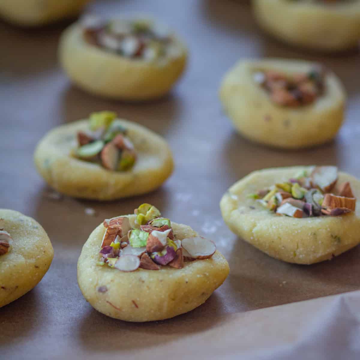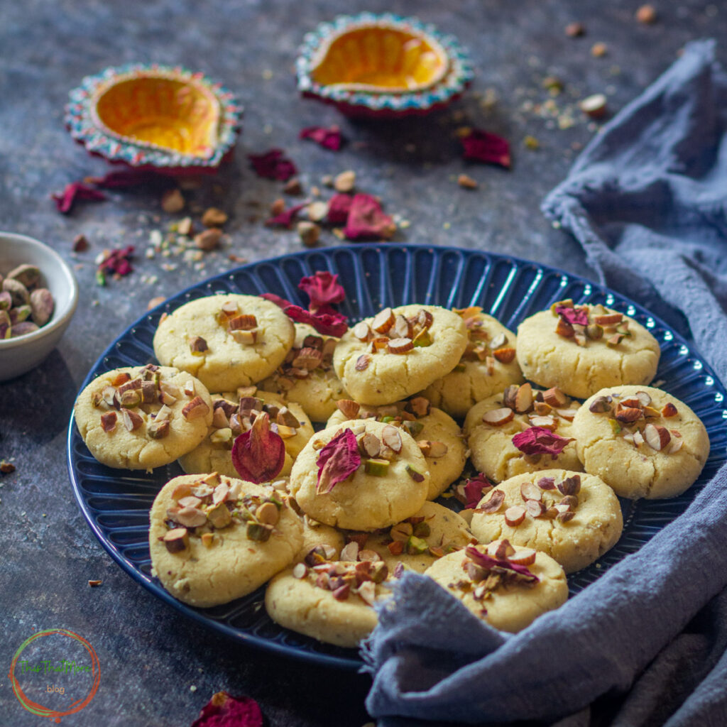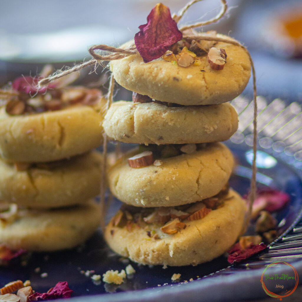 I do add an extra layer of flavoring to these delicious Indian cookies by adding cardamon powder & fennel powder in the cookie dough. I top them with roughly chopped nuts like pistachio, almonds & cashews.