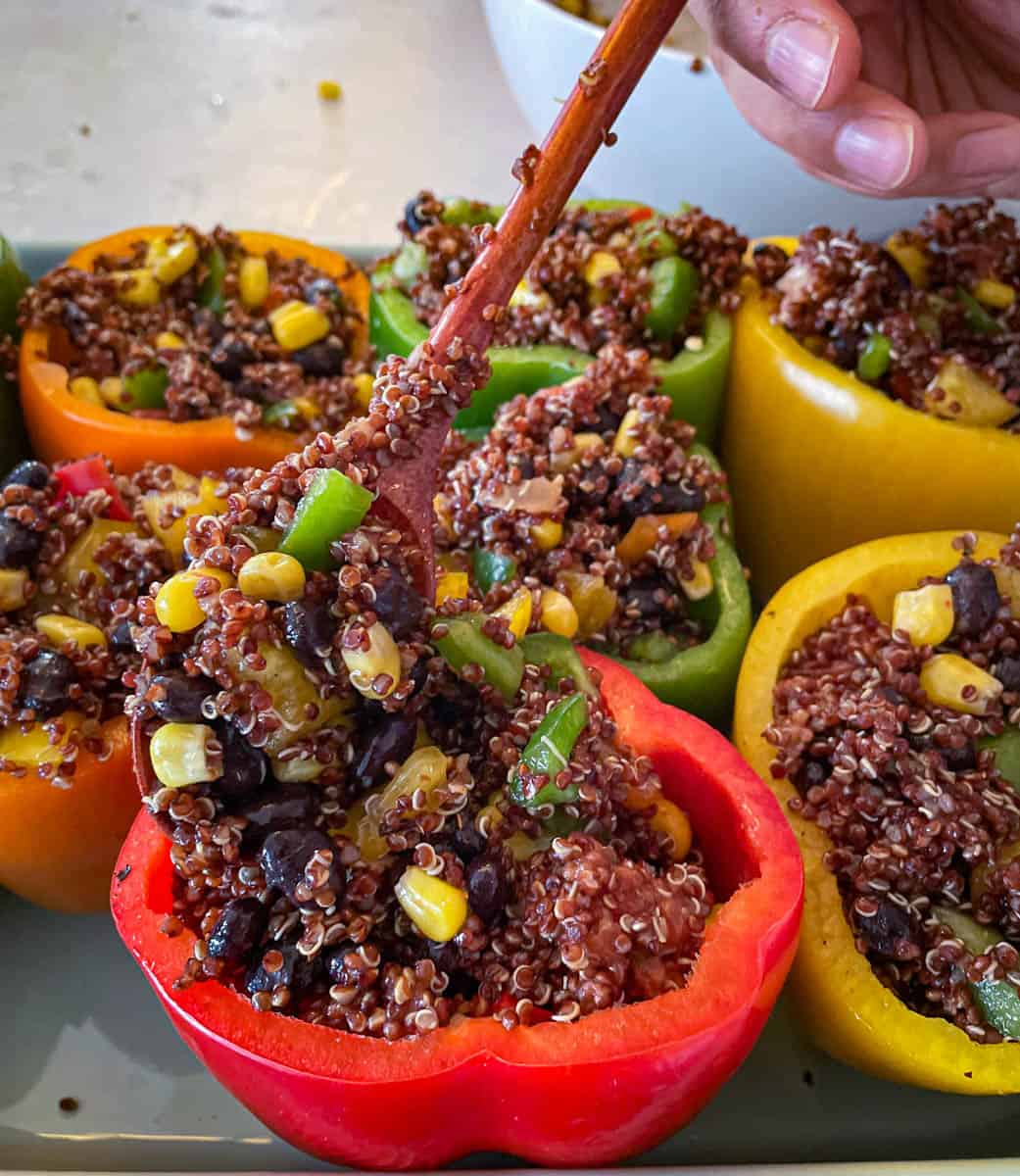 - In a bowl, add cooked quinoa, beans, corns, salsa/ tomatoes, chopped bell peppers, and seasoning. Mix the ingredients until properly combined. Using a spoon, add the stuffing to the peppers.