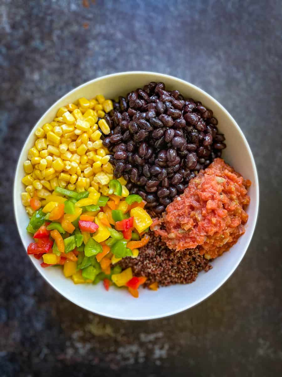 - MAKE THE STUFFING: In a bowl, add cooked quinoa, beans, corns, salsa/ tomatoes, chopped bell peppers, and seasoning. Mix the ingredients until properly combined.