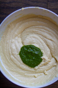 - Transfer the batter to a mixing bowl and add green chutney to the batter. Whisk using a wooden spoon for 2-3 minutes until the batter is airy. (Note: Check the batter by adding a teaspoon of batter in a glass of water. If the batter stays on the top, that means the batter is ready. But if it sinks then you need to whisk the batter a little longer).