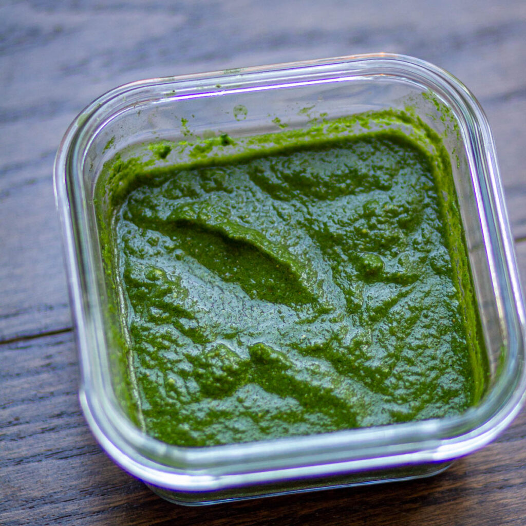 - Add all the ingredients of green chutney in Vitamix or any other grinder. Add water little by little and blend everything until smooth. Transfer the chutney in a bowl.