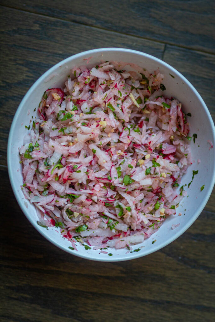 - MAKE SALAD: Make the salad by mixing grated radish, ginger, green chilis, spices, and lemon juice until combined properly.