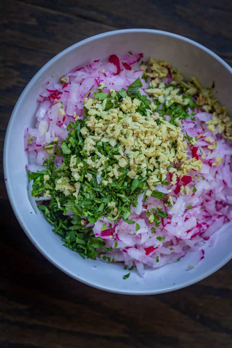 - MAKE SALAD: Make the salad by mixing grated radish, ginger, green chilis, spices, and lemon juice until combined properly.