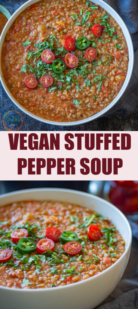 Stuffed Pepper Soup is warm, comforting, and bursting with flavors. It is vegan and is made by adding bell peppers, rice, lentils, roasted & diced tomatoes along with some spices.