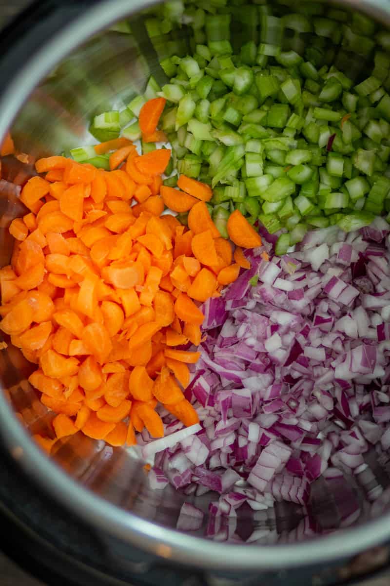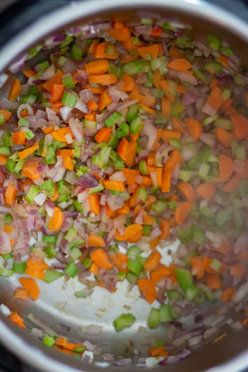 - Press Saute and put oil in the Instant Pot. When the oil is hot then add onion, carrots, jalapenos, garlic, celery, and cook for 2-3 minutes until soft & tender.(Note: If you don't want the soup to be spicy, you can de-seed the jalapenos).