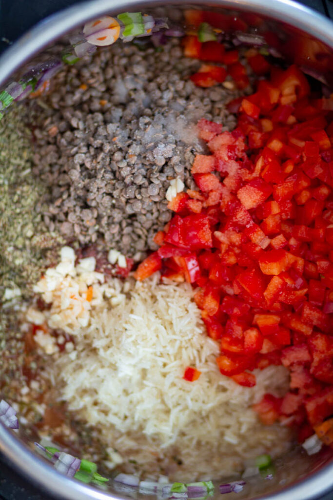 - ADD OTHER INGREDIENTS: Add lentils, rice, bell peppers, tomatoes, and stock/water. Then add your choice of spices & seasonings.