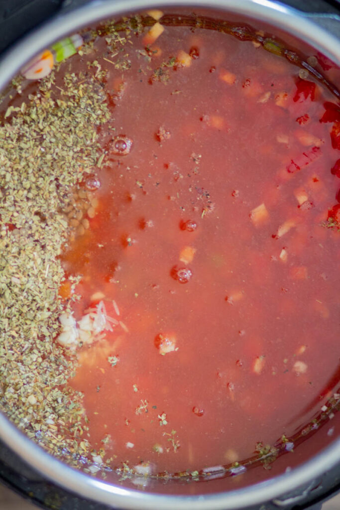 - Add rinsed lentils, rice, bell peppers, diced tomatoes, and tomato sauce along with stock/water in the pot. Add Italian seasoning, salt, Cayenne Pepper, and Thyme and stir.