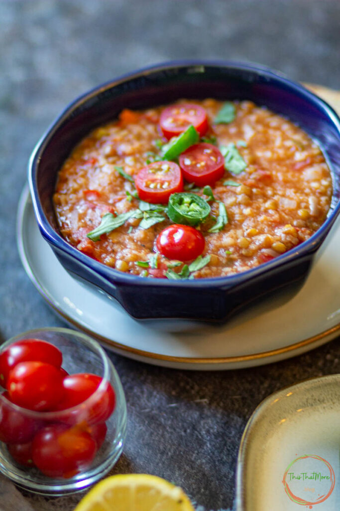 This soup itself is very filling but you can s.till pair it with some bread. I like it with home-baked Focaccia Bread or Pesto Babka. You can add any seasoning of your choice. You can also experiment with the grain (white rice, brown rice, quinoa, etc.), though I like the texture better with white rice. Also, any colored lentil too will work in the recipe.