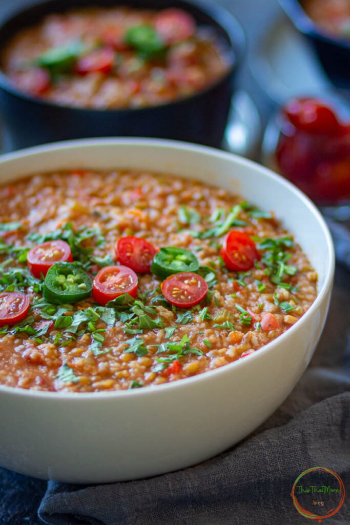 This soup itself is very filling but you can s.till pair it with some bread. I like it with home-baked Focaccia Bread or Pesto Babka. You can add any seasoning of your choice. You can also experiment with the grain (white rice, brown rice, quinoa, etc.), though I like the texture better with white rice. Also, any colored lentil too will work in the recipe.