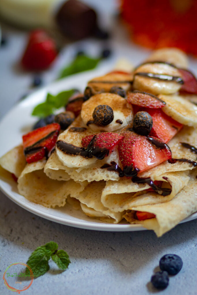 - Add some nut butter and sliced fruits in the crepes and roll them. Garnish with some more fruits and coconut whipped cream on the top. Drizzle chocolate syrup & maple syrup and serve.