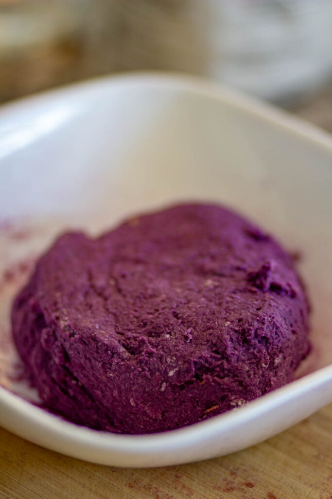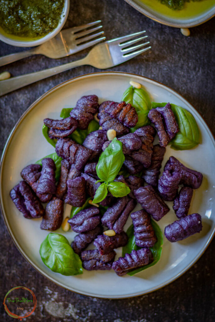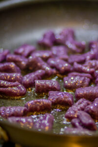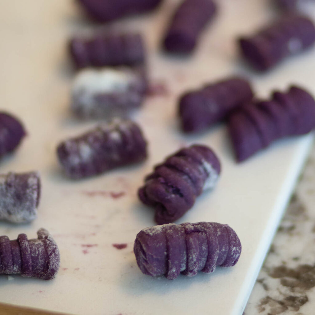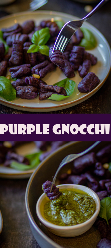 Sweet Potato Gnocchi is easy to make and taste just like a store-bought one. You can experiment with different varieties of sweet potatoes in the recipe. I have used purple sweet because of its gorgeous purple color. It is made by rolling the dough of sweet potatoes, flour, and nutritional yeast.
