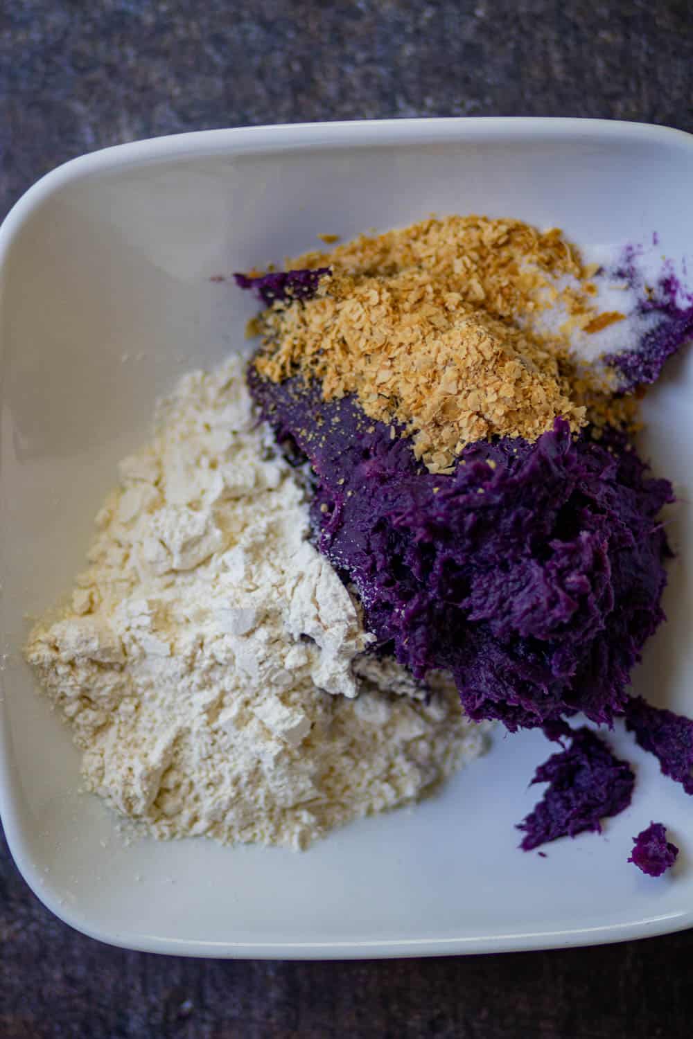 - MAKE THE DOUGH: Add Sweet potatoes, flour, nutritional yeast to a bowl. Stir all the ingredients until properly combined and forms a dough.