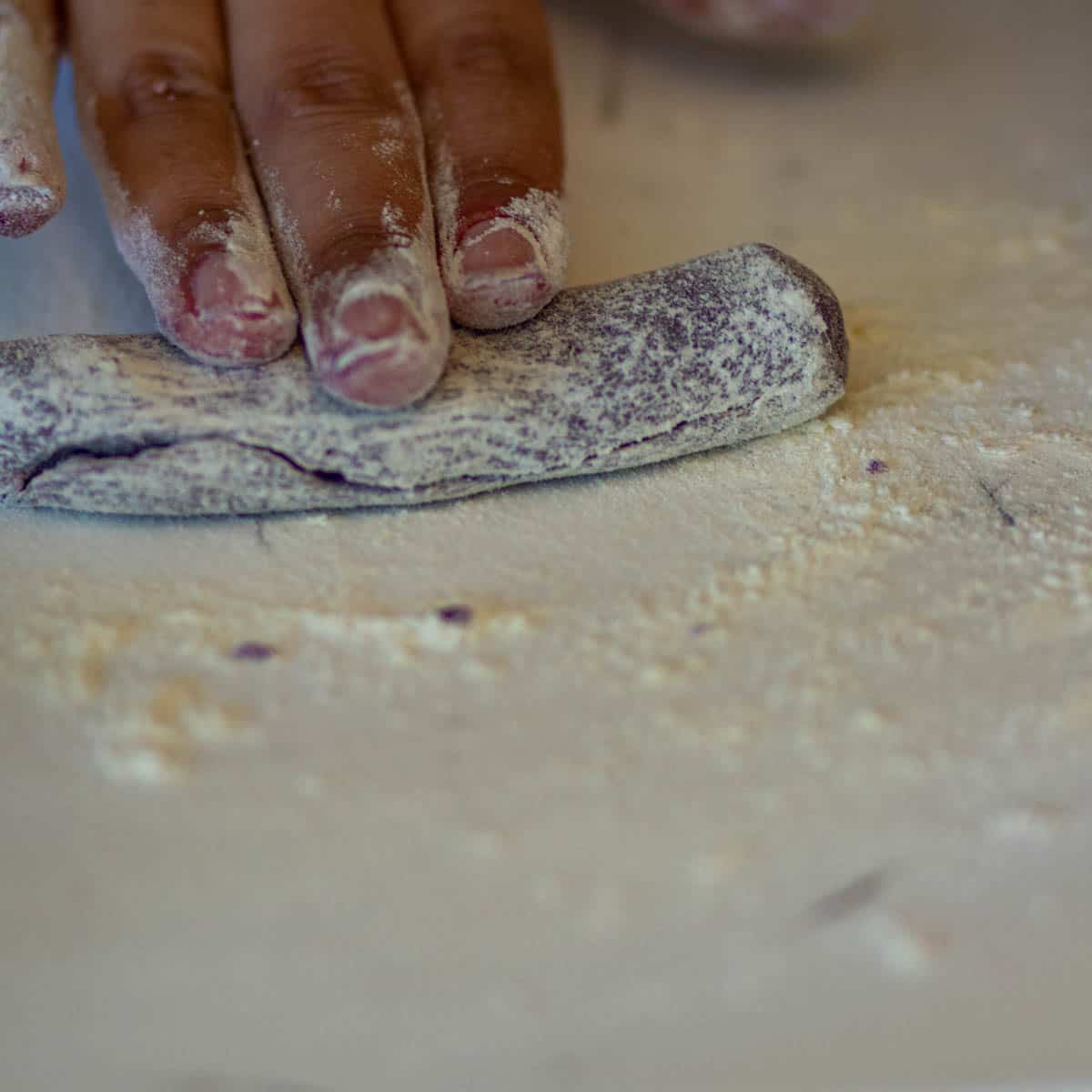 - ROLL THE DOUGH: Using your hands roll the ball into a cylindrical log of ½ inch in thickness.