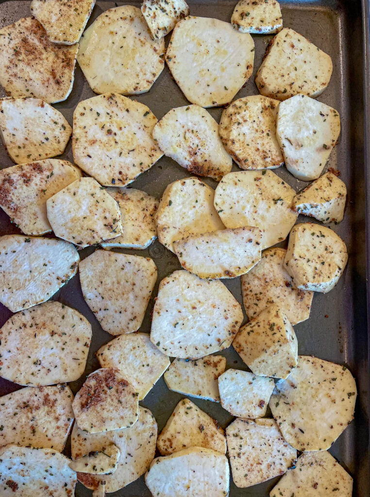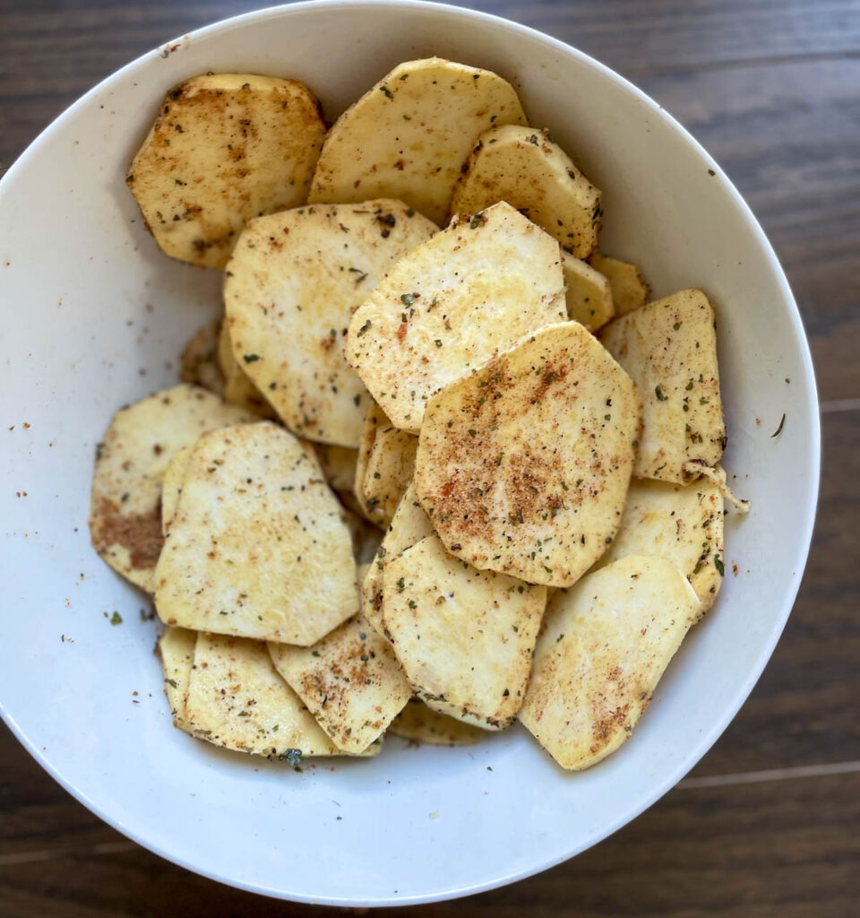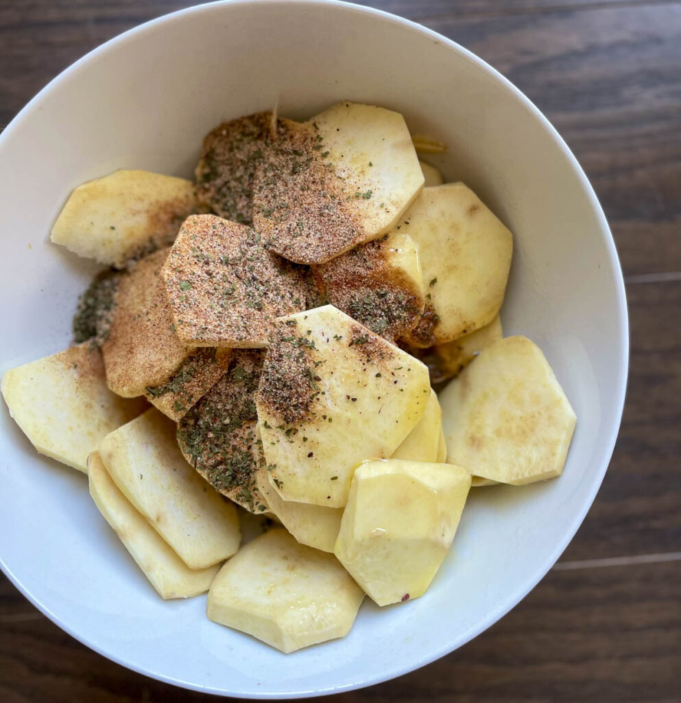 - SEASON THE SWEET POTATOES: Mix spices with sweet potatoes until the sweet potatoes are evenly coated.