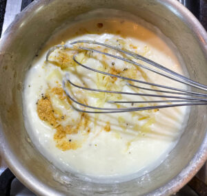 - Then slowly put milk in the pan. Whisk continuously so that the sauce is free of lumps. Let it boil till it reaches the consistency of a sauce. Then add garlic powder, salt & pepper. Cook for 1 more minute.