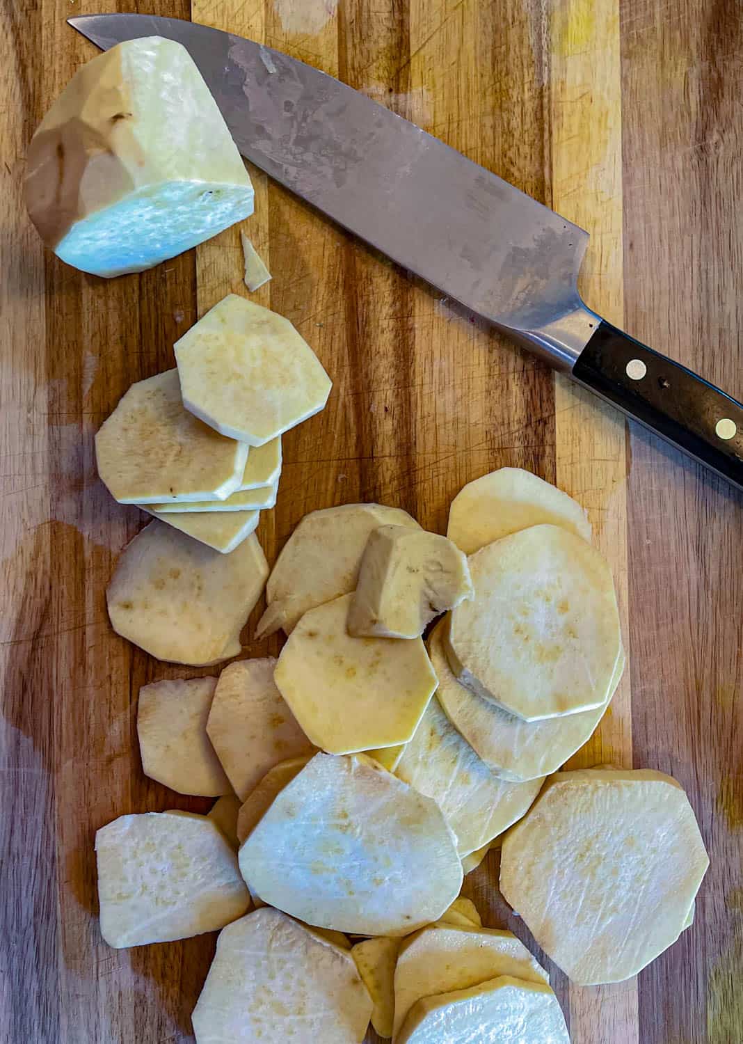 - CUT THE SWEET POTATOES: Peel the skin and wash them. Then finely slice the sweet potatoes.